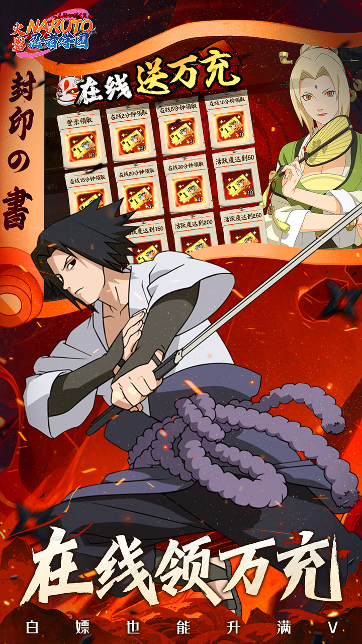 ★天天送648代金券,商城礼包0元购! ★在线活跃送万元充值卡,白嫖也能升满V! ★每日登录送千抽、强力忍者任你选! ★满星忍者免费送,0氪也能当大佬! ★连续登录送稀有忍者,7天登录送迈特凯! ★推图闯关升级忍者证明可得海量代金券!