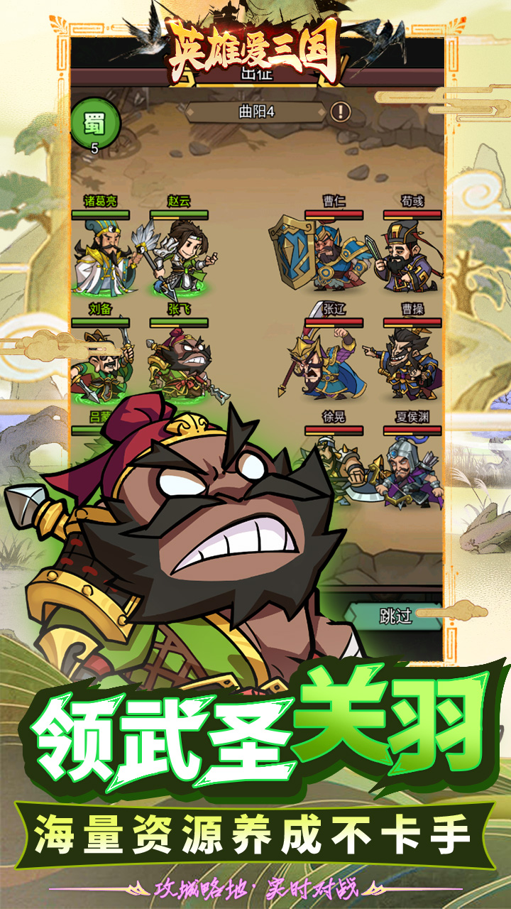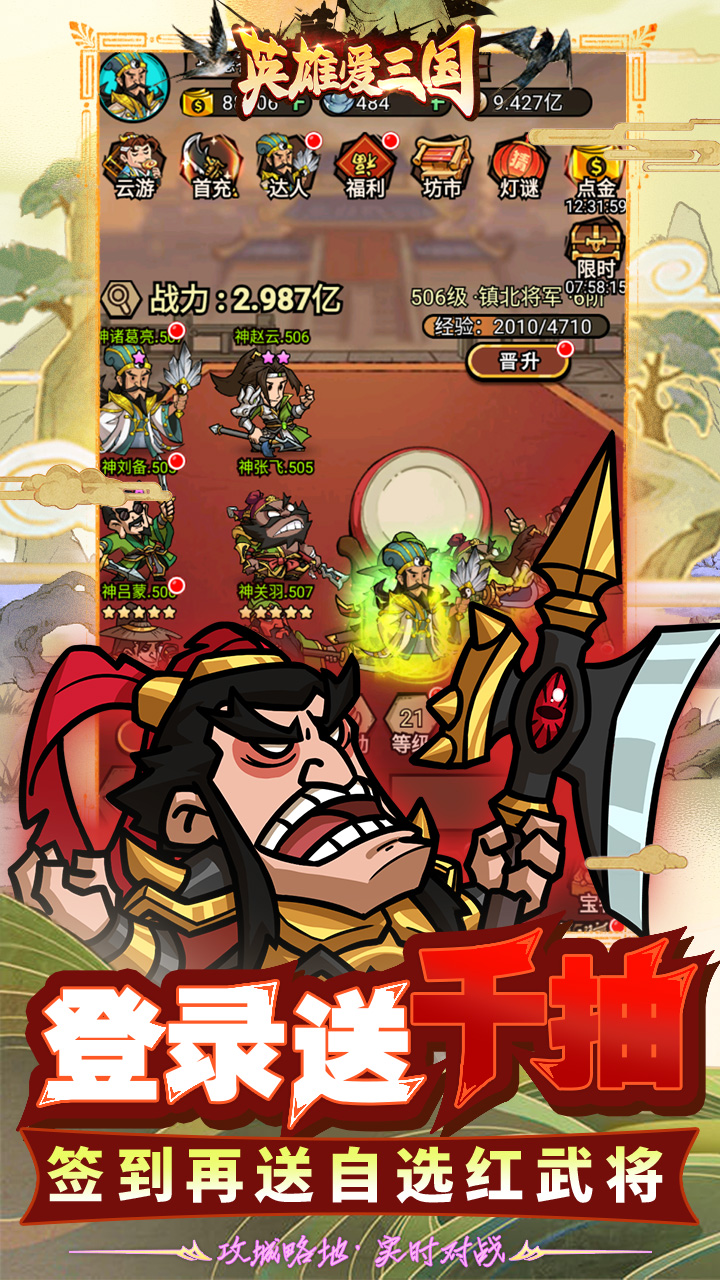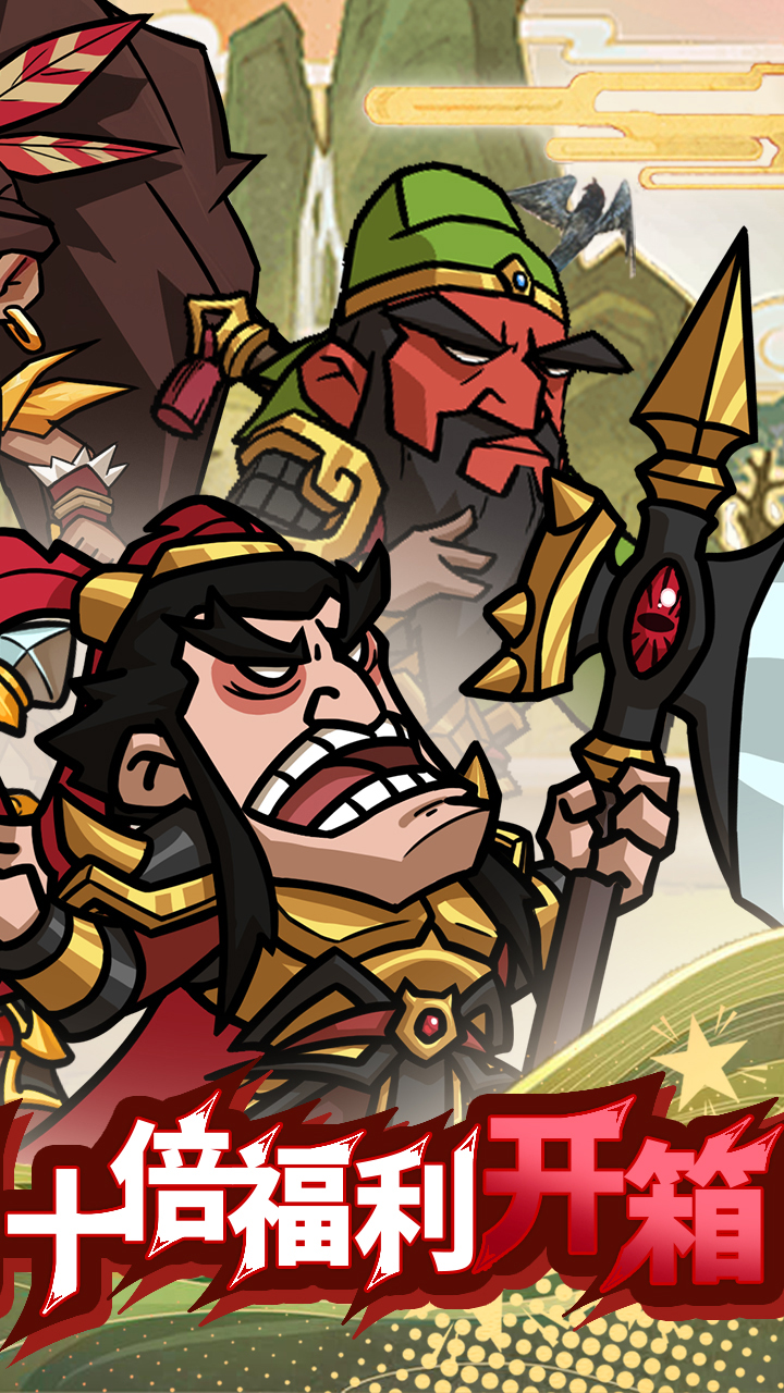 *首冲即送红将关羽 *开局一棒槌 武将全靠敲 *做任务即送代金券 *真实0.1折三倍高返,拒绝福利膨胀! *海量福利礼包领到手软