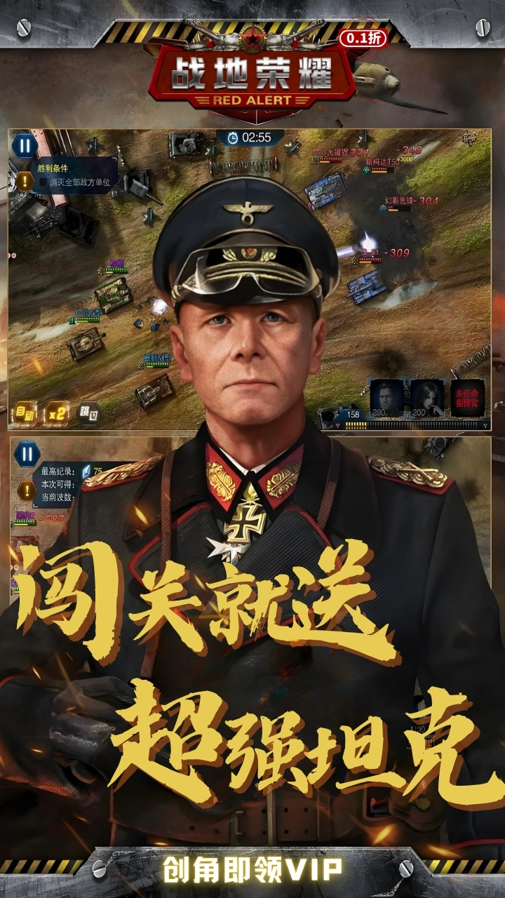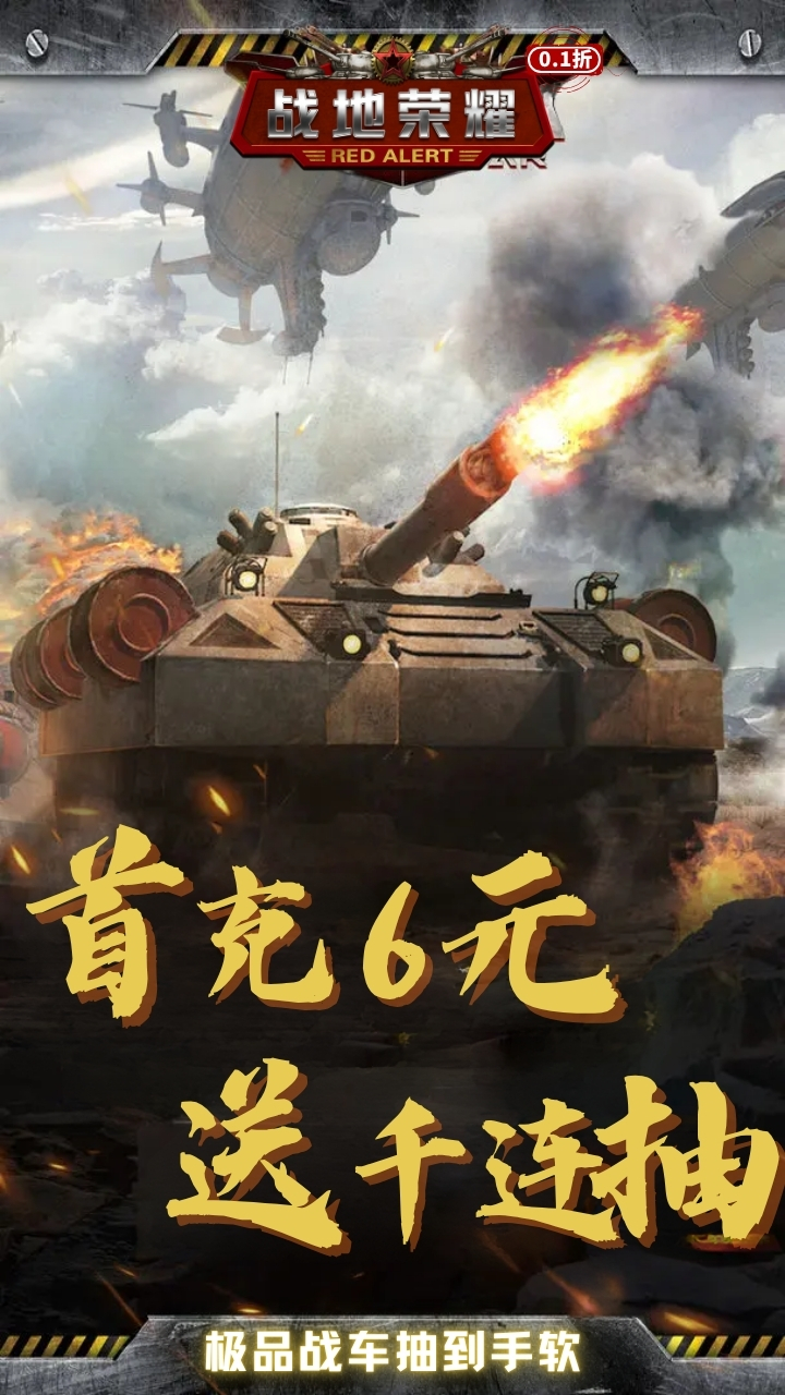 闯关就送SS+超强坦克,进游就送每日登录狂送真冲卷,游戏内任意商品充值0.1折首充原价6元,折后仅需0.06元,升级送十万充值,VIP免费送,挑战关卡累计1000抽,SS+坦克免费送至10星!