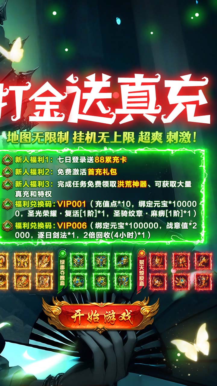 1.创角即送切割神装;会员卡;10万元宝。 2.登录送累充卡:七日登录送88累充卡(可激活线上累充)。 3.超级贵族:打怪收集碎片直升满级。 4.洪荒神器:完成指定任务就能免费领取,可获取大量真充和特权。 5.0元装扮:完成目标任务免费激活。 6.实物兑换:兑换可获取充值点,充值点可充值兑换灵符和累充额度。 7.免费首充:领取88累充卡可直接激活首充礼包。 8.每日福利:完成任务每日可获取大量元宝和实物(可兑换充值点) 9.活动玩法:超多活动玩法,参与即可获取大量材料、充值红包、装备等;更有跨服活动等你探索。