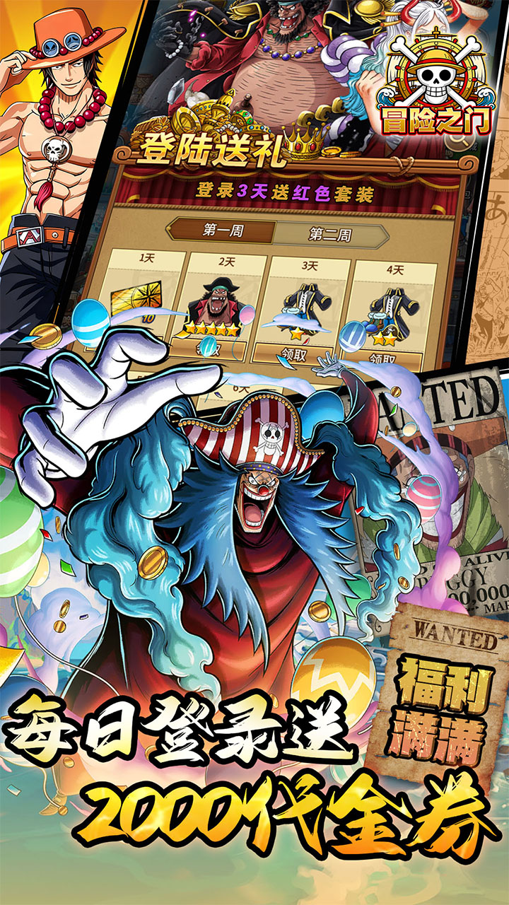 1.每天送2000代金券,无门槛可拆分! 2.登录送大和,黑胡子已经顶级6星红装 3.每日签到送高级招募,十连抽享不停 4.IP联动,龙珠火影海贼大乱斗。