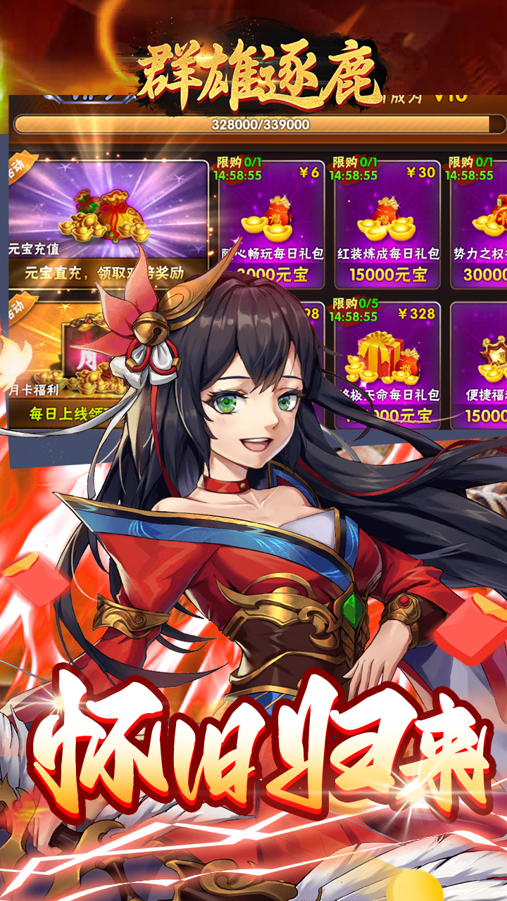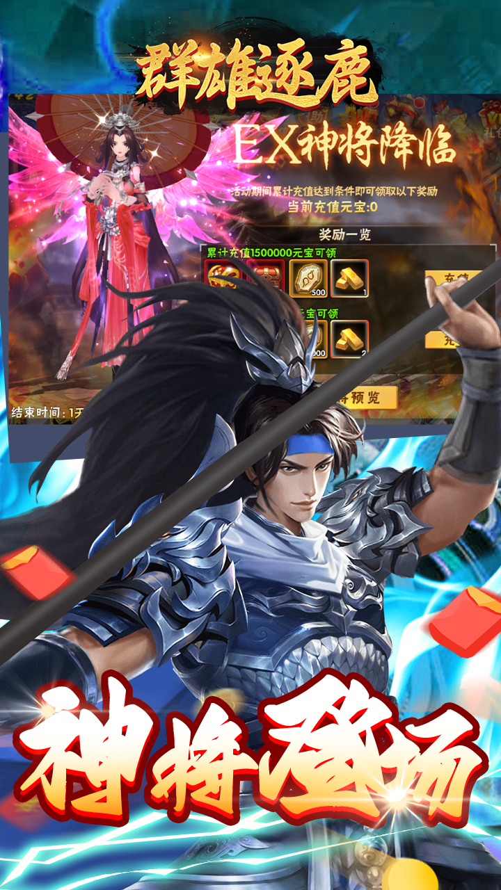 1.开局送800现金点,可直接购买全神将礼包。 2.充值比例1:4000,内置0.1折爽充超值返利。 3.登陆免费送88888元宝、1亿金币、精英招募令*100、328元返利券、648元返利券。 4.登陆激活武圣关羽 5.登陆即享满级GM特权,GM商城全场1元宝购买. 6.新增现金点活动,奖励多多、福利多多!!