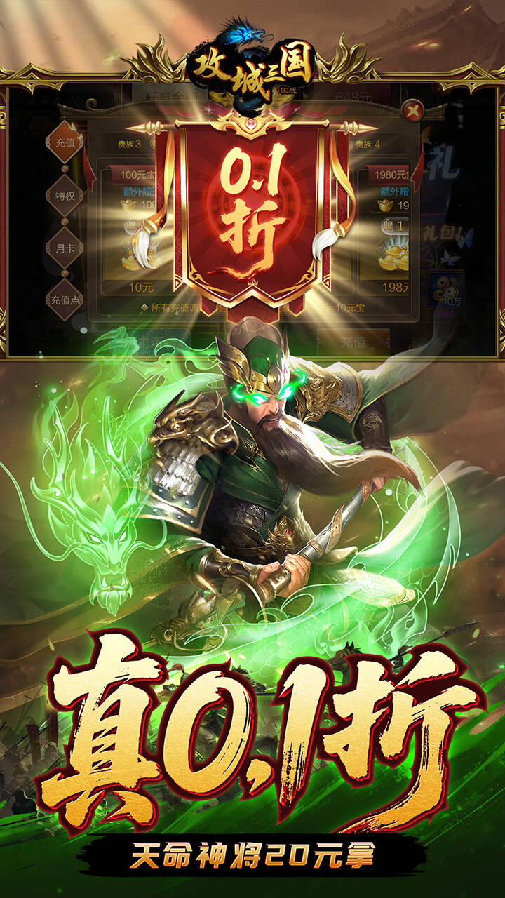 1、游戏内所有支付仅需0.1折,648充值仅需支付6.48元 2、上线送VIP3、1000元宝、100w铜钱 3、27级下载豪礼送1000元宝、高级邀贤20连抽、30孙子兵法、100铜雀令 4、次日登录送神将于吉 5、首冲任意金额送经验加速礼包,快速升级体验海量玩法系统