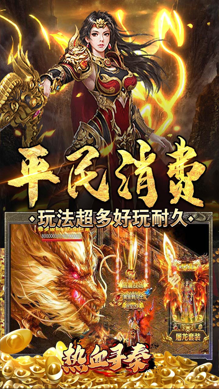 1、上线送超炫技能、全套装备、创世之谜、龙神之心等,超值福利领不停! 2、充值比例1:10,天天免费送3280代币,超高返利超高充值超级爽! 3、平民消费,玩法超多,经久好玩,打怪爆真充,装备保值!