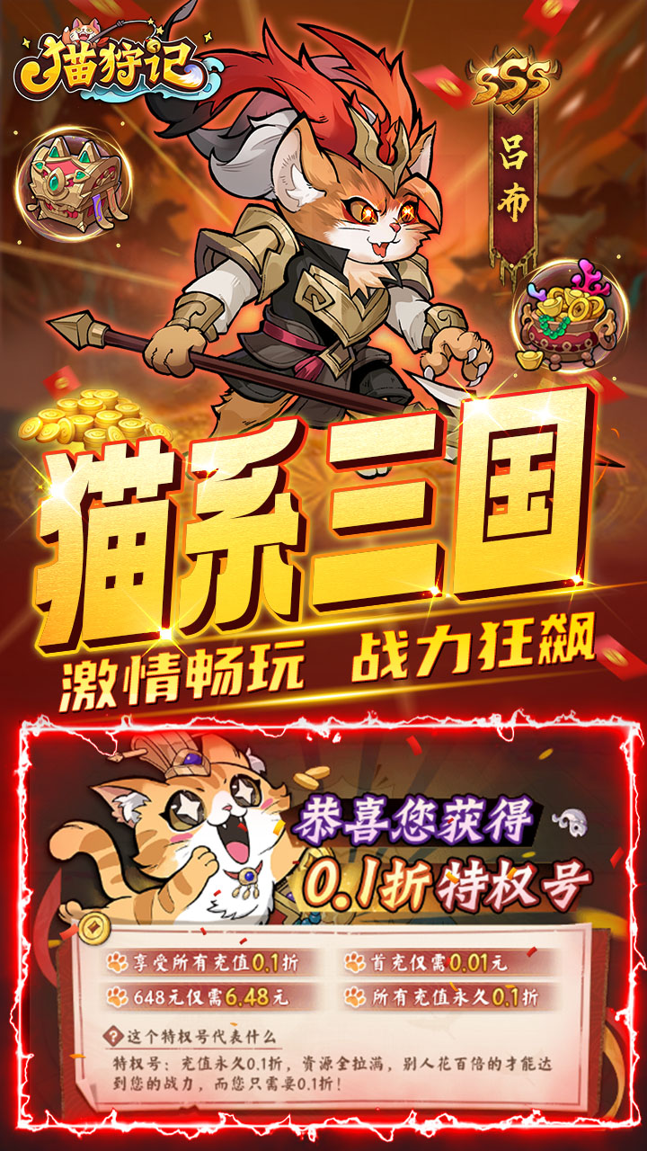 所有充值畅享0.1折 登录领取648真充券 推关领取免费千抽 首冲就送神将-吕布,次日登录领取吕布皮肤 充值最高可额外领取4W代金券福利及海量道具 大额返利门槛更低!价值更高!