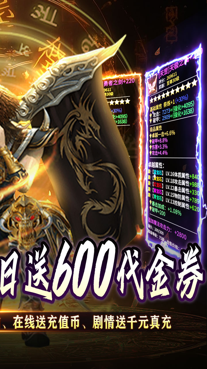 1、上线送范围拾取、自动捡物、自动吃经验、自动吃货等,超值福利领不停! 2、充值比例1:100,双倍货币返利,首次充值赠送超值豪礼,称号、宠物、坐骑送个不停! 3、创新五流派,一怪一专属,五行觉醒神技独有,散人逆袭就在一瞬间! 4、全图高爆,各种装备神装爆个不停,打怪就爆实物,兑换充值币无上限! 5、全新三折代金卷系统,每天登录免费送600代金券,散人逆袭称王! 6、天道悬赏专属玩法,各类剧情专属任务,真实回归传奇本色!