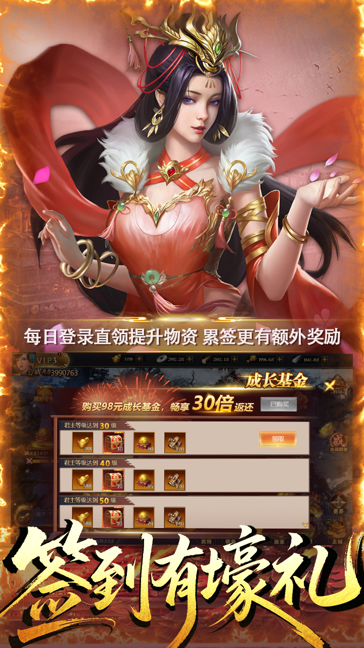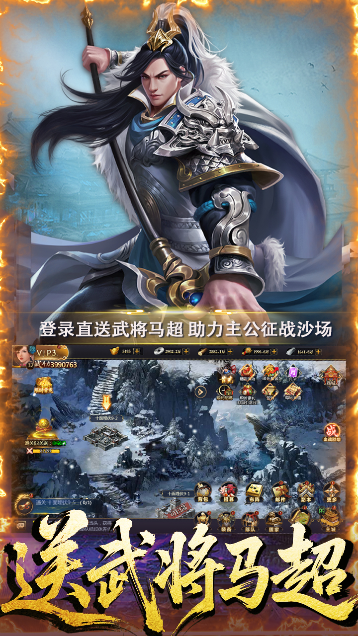 1、登录送武将马超,助力主公征战沙场! 2、开局送贵族10,解锁各种特权福利! 3、全新首充福利,首充即可获取强力武将赵云! 4、充值比例1:100000,所有档位0.05折超值返利!