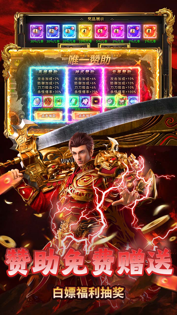 1.创角即送麻痹、复活神器,施毒术、开天斩两大神技,更有自动回收、自动拾取和海量元宝经验。 2.天天送328:每日登录领328代币。 3.福利抽奖:每杀30只怪可抽奖一次,法宝、灵符、充值点通通可获取。 4.实物兑换:无限回收额度,实物满地爆 5.免费赞助:使用悦福包可免费激活。 6.杀怪奖励:每日击杀怪物可获取大量元宝。 7.VIP:使用悦福包获取充值点免费激活。 8.在线奖励:累计在线可获取逐日剑法。红包和大量材料。 9.活动玩法:超多活动玩法,参与即可获取大量材料;装备