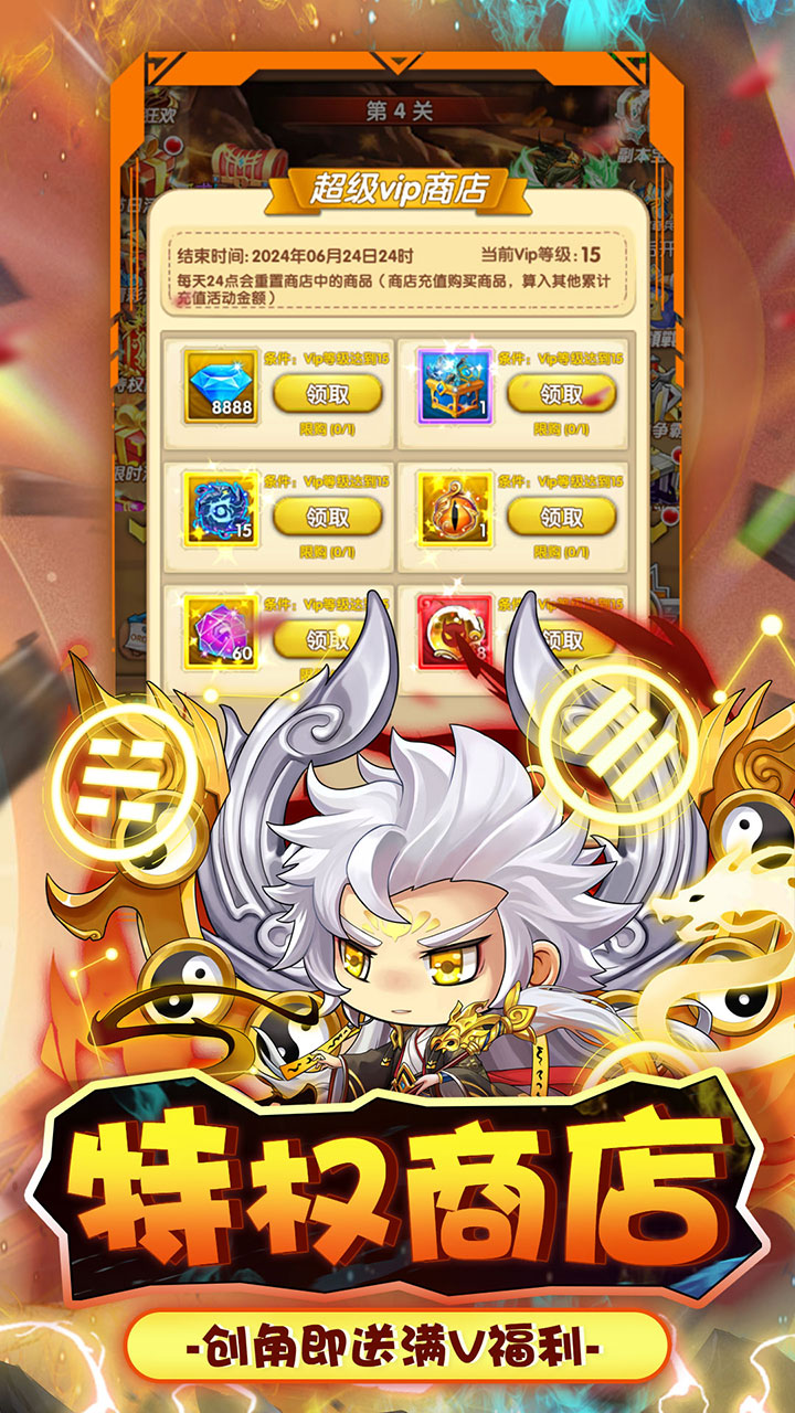 1.创角即送满V、888888钻石 2.每日上限赠送648代金券,不花钱也能充到爽! 3.开服七日登录送豪礼,顶级阵容等你拿! 4.开服狂欢每日福利登录即送,幻彩英雄免费拿! 5.会员专属礼包每日免费领取 6.上线即满V、特权免费解锁