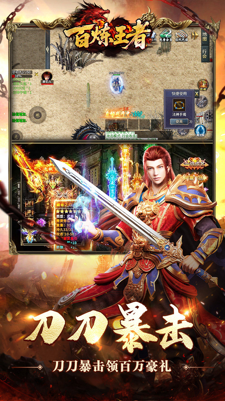 1、【上线即送】自动回收、自动拾取、范围拾取、海量材料! 2、【充值返利】充值比例1:1000,超多福利领不停,每日福利免费领,超多返利领不停! 3、【首杀首爆】首位击杀得大量货币,逆袭称霸不是梦! 4、【免费神器】真实攻速,杀怪即可免费获得攻速火焰! 5、【攻速三职业】职业平衡,刀刀攻速,刀刀暴击爆好物!