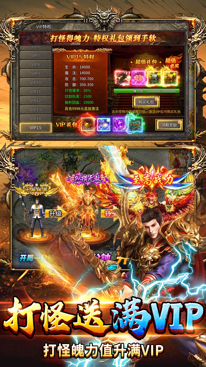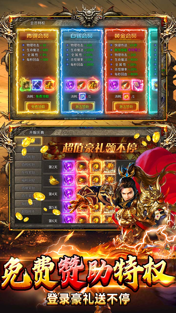 1.免费赞助:开局免费送青铜赞助 2.免费特权:免费自动拾取、自动回收、自动货币、自动使用经验特权 3.白嫖VIP:击杀怪物获取魄力值激活满级VIP 4.登录奖励:登录游戏,在线时长送海量元宝,绑定灵符,绑定武侠币 5.首爆首杀:怪物首杀获取充值红包 6.武侠玩法:百种剧情,武林绝学,千件专属一切全爆