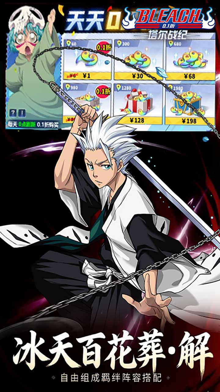 游戏内达到35级后每日赠送648代金券,可购买任意礼包 开服活动赠大奖,七日目标海量资源免费领 游戏内所有充值礼包都享受0.1折优惠 收集送豪礼,集齐角色领奖励 闯关送豪礼,参加副本可获得大量奖励 七日签到送好礼,SSR冬狮郎免费送